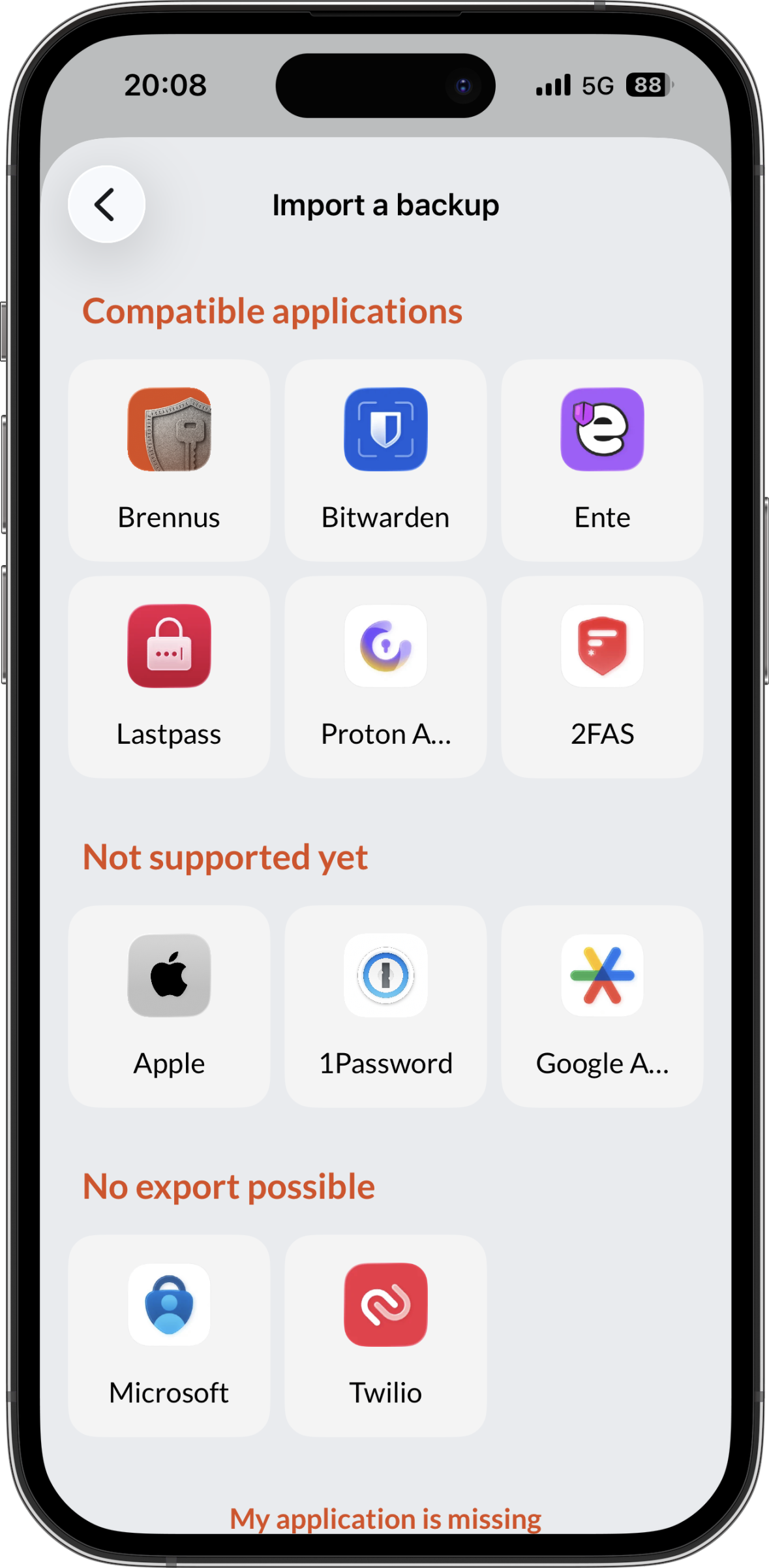 Already using another app and want to switch to Brennus OTP? It's easy with our import feature.